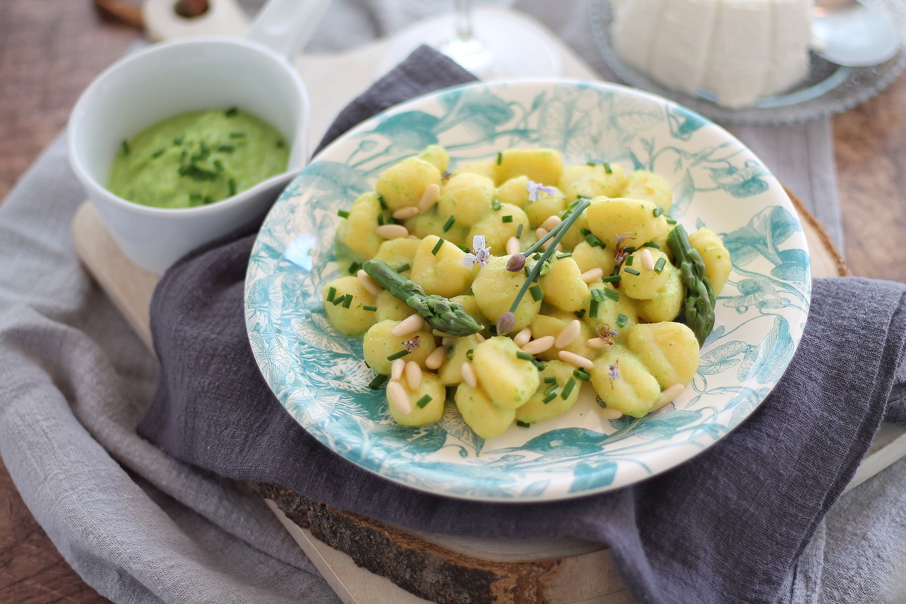 Conditeli con il pesto appena preparato, le punte d’asparago e i pinoli tostati. Decorate con l’erba cipollina tritata e servite.