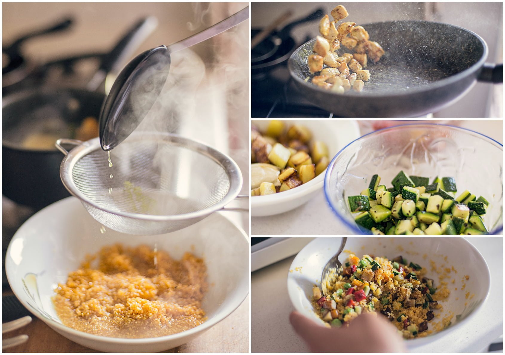 Tutti gli ingredienti sono pronti per assemblare il Cous Cous. Aggiungi nell’ordine: le verdure, 1 tappo di aceto di vino e per finire il pollo.